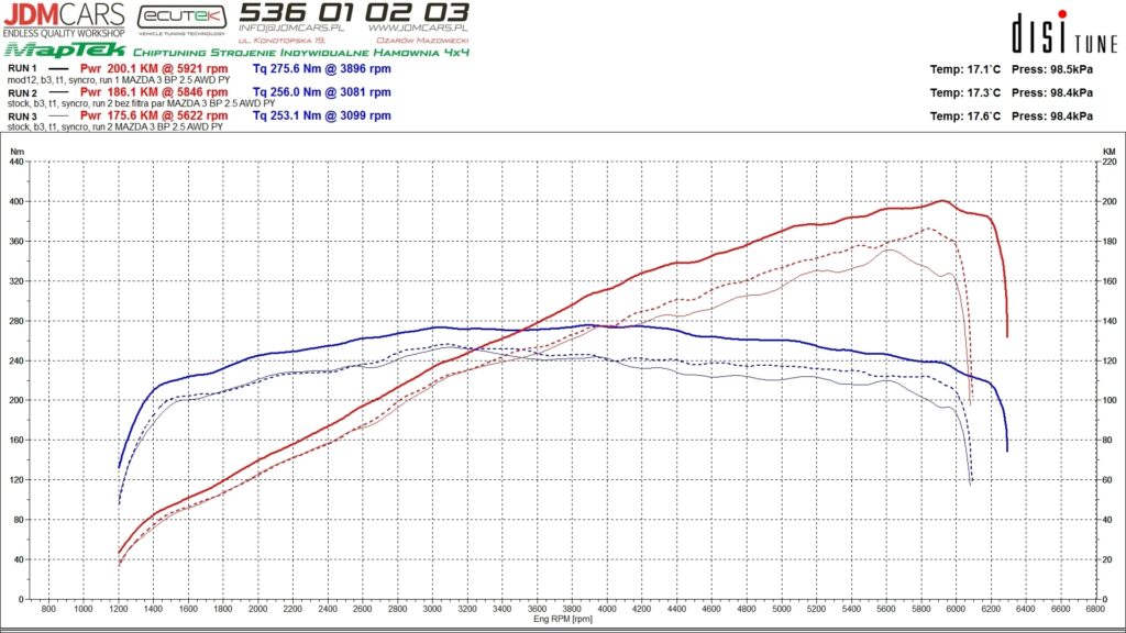Szczerze mówiąc zawsze podchodziłem z dużą rezerwą do opowieści o tym jak to usunięcie filtra par paliwa z puszki dolotu (charcoal air filter) zwiększa moc ale nigdy nie miałem okazji do weryfikacji tego „własnoręcznie” bo samochody albo przyjeżdżały już bez tego filtra albo miały zmieniony układ dolotowy. Aż do tego auta. Zapytałem właściciela o pozwolenie i voila oto i test. Czy to naprawdę dało aż 10KM? I tak i nie, głównie ze względu na to, ze pomiary seryjnego samochodu z zamontowanym tym filtrem były strasznie poszarpane i nierówne i zdarzały się „wystrzały” na 180-181KM ale wykres wyglądał tak źle że szkoda go było zapisywać, a po usunięciu filtra jak ręką odjął, niemalże gładkie jak stół i dwa pomiary z rzędu kreska w kreskę. Zatem może i nie 10KM ale naprawdę warto to gówno wywalić. Kolejny ekologiczny „usprawniacz”.