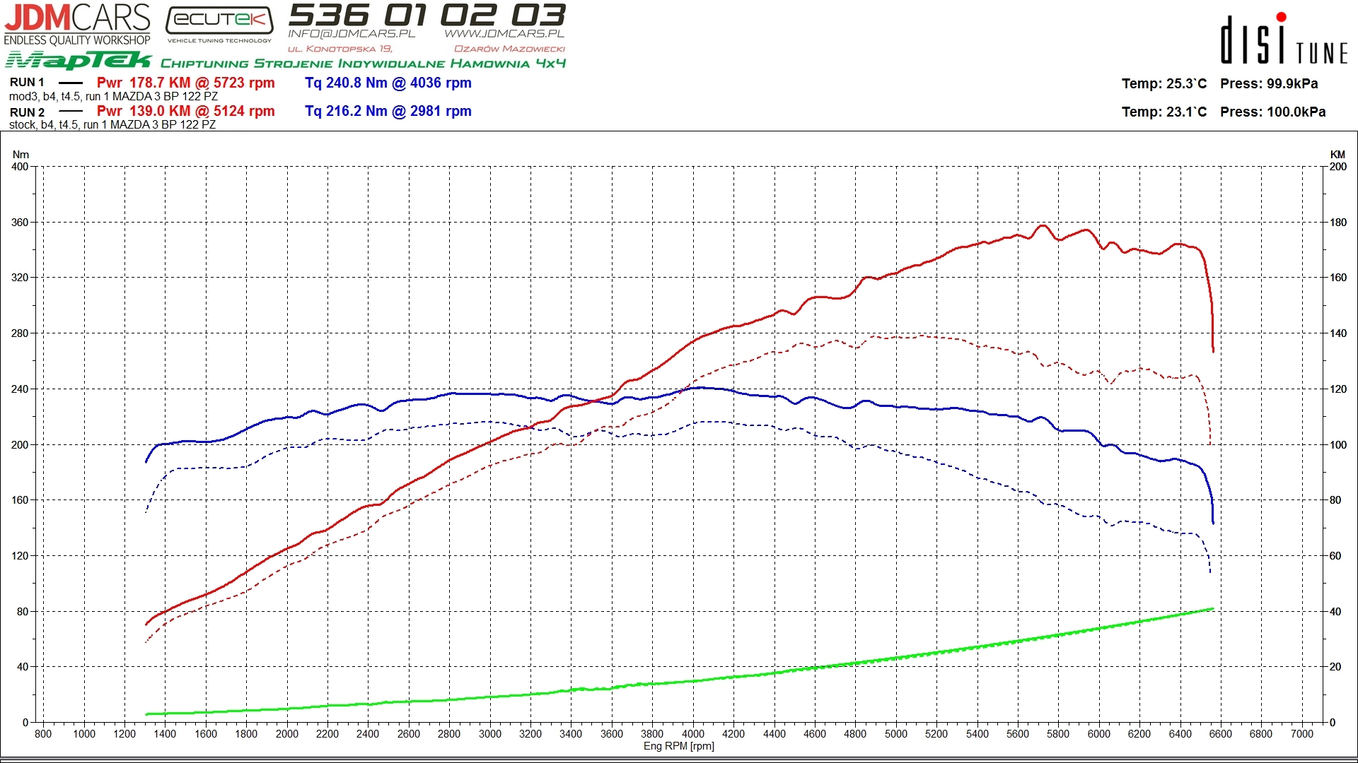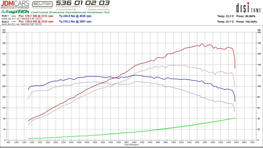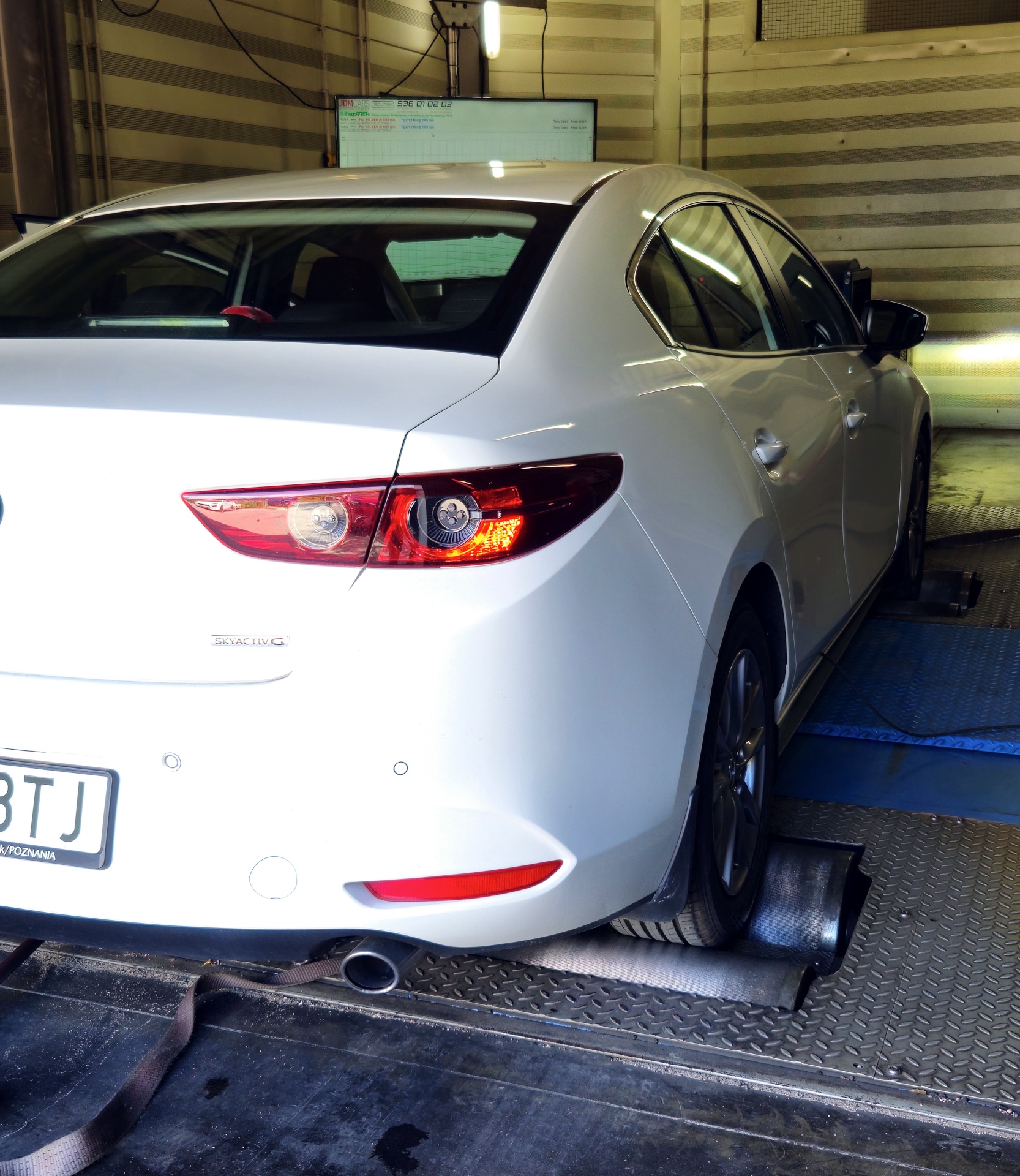 Mazda 3 BP z silnikiem o deklarowanej przez producenta mocy 122KM i momencie 213Nm Zmierzone faktyczne parametry seryjne: 139KM 225Nm Parametry po wykonaniu pełnej modyfikacji: 176KM 233Nm