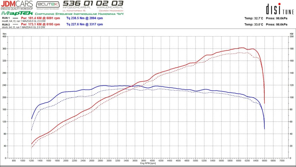 Parametry uzyskane po modyfikacji: 181KM 238Nm