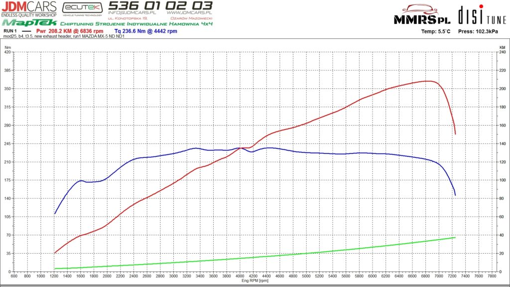 Zmierzone parametry seryjne z zamontowanym tłumikiem: 184KM 220Nm Parametry zmierzone po montażu kolektora wydechowego i wałków bez modyfikacji sterownika silnika: 206KM 222Nm Parametry po modyfikacji sterownika silnika: 231KM 244Nm
