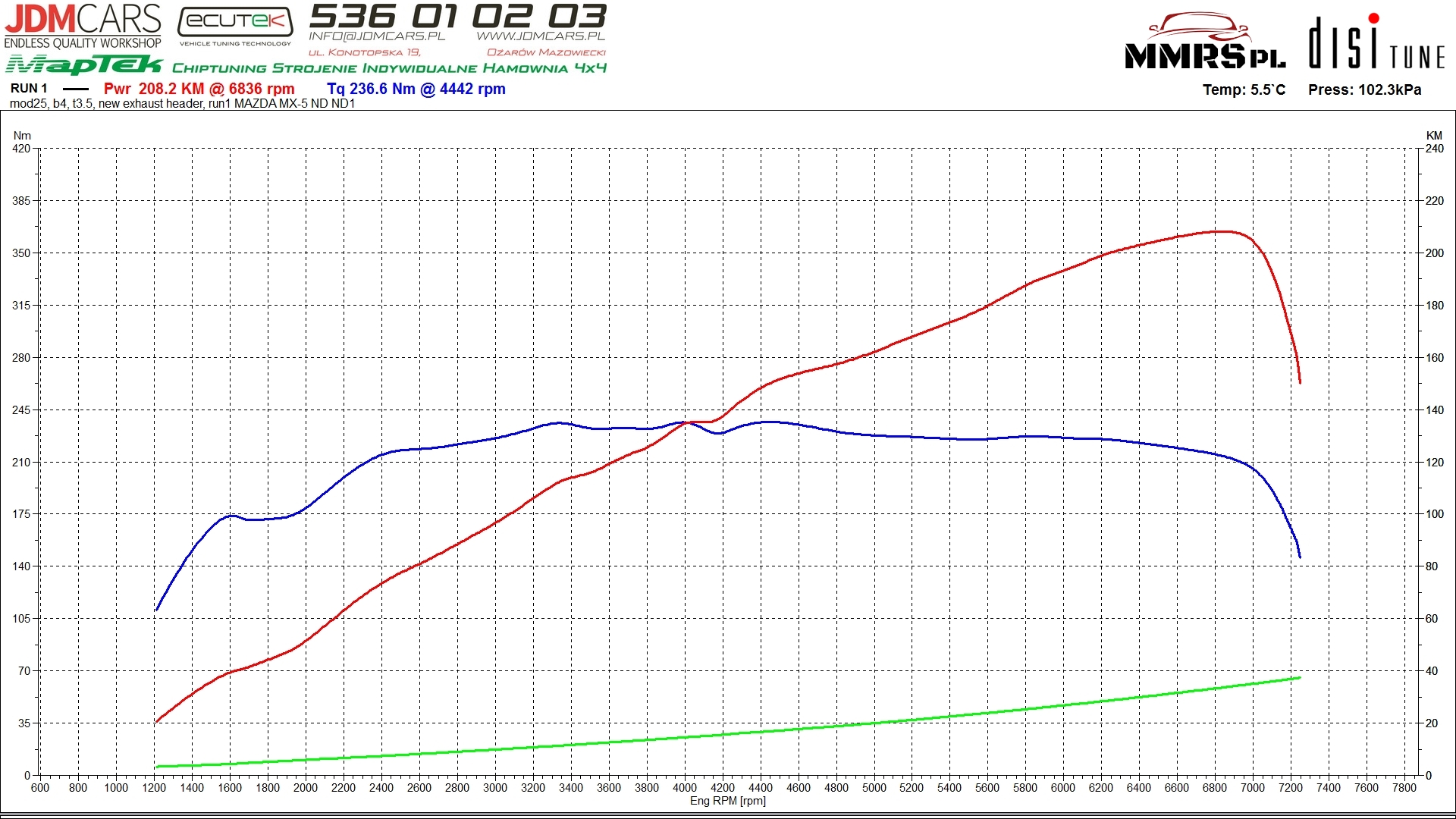 Zmierzone zastane parametry: 228KM 268Nm Parametry po wykonaniu strojenia od zera: 242KM 293Nm